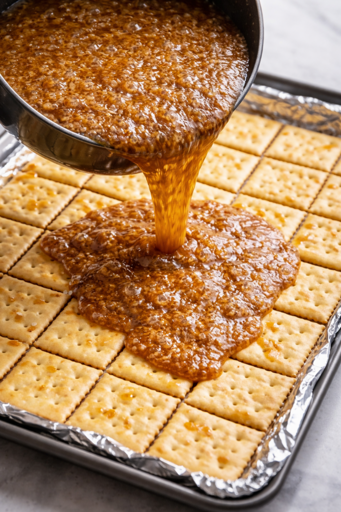 Step 4: Pour and spread immediately. Remove the toffee from heat and pour it evenly over the crackers right away it begins setting within seconds. Use a heat-safe spatula to quickly spread it to cover every cracker. Work fast but do not panic.